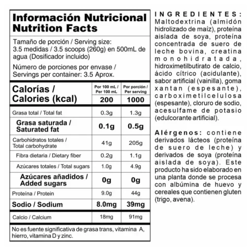 La Megaplex Creatine Power de Nutramerican es una proteína hipercalórica con creatina, especialmente diseñada para promover el aumento de masa muscular, fuerza y recuperación después del entrenamiento. Su fórmula combina proteínas de alto valor biológico, carbohidratos de calidad y creatina monohidratada, optimizando tanto el rendimiento como el crecimiento muscular. Disponible en deliciosos sabores vainilla y cookies and cream, se convierte en una opción ideal para quienes buscan resultados efectivos sin sacrificar el sabor. Perfecta para atletas, culturistas o personas con metabolismo acelerado que necesitan un extra de calorías y nutrientes para alcanzar sus metas.